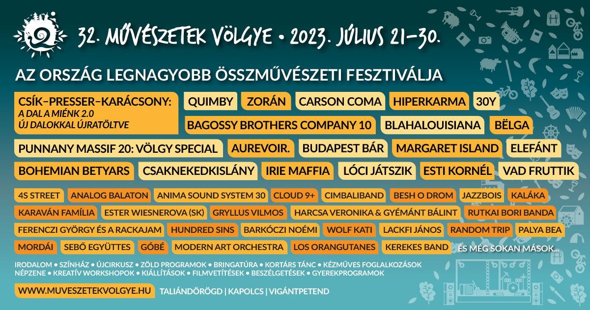Július 21-én, pénteken kezdődik a 32. Művészetek Völgye; a fesztivál tíz napon át összesen 2200 programmal, koncertekkel, színházi előadásokkal, irodalmi programokkal, jógával, workshopokkal és biciklitúrával is várja a közönséget Kapolcson, Taliándörögdön és Vigántpetenden.